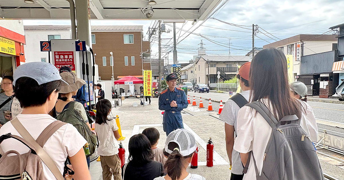 みんなで給油するところ見て、子どもたちと一緒にはしご車に手を振ってお見送り。