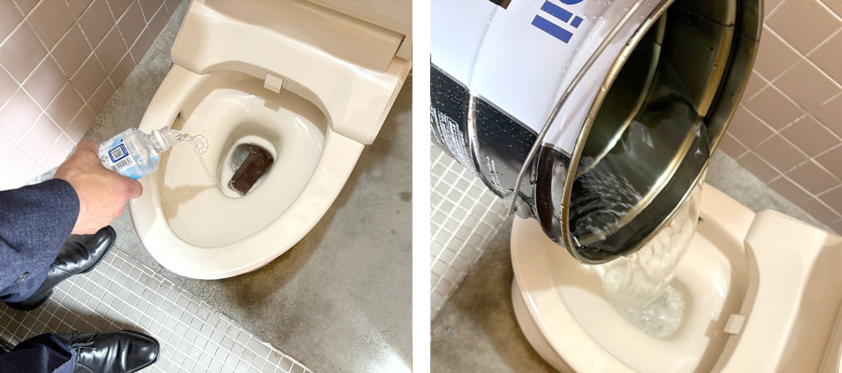 ペットボトルの水では水量不足で流れず、流すためにはたくさんの水が必要ということが分かった。