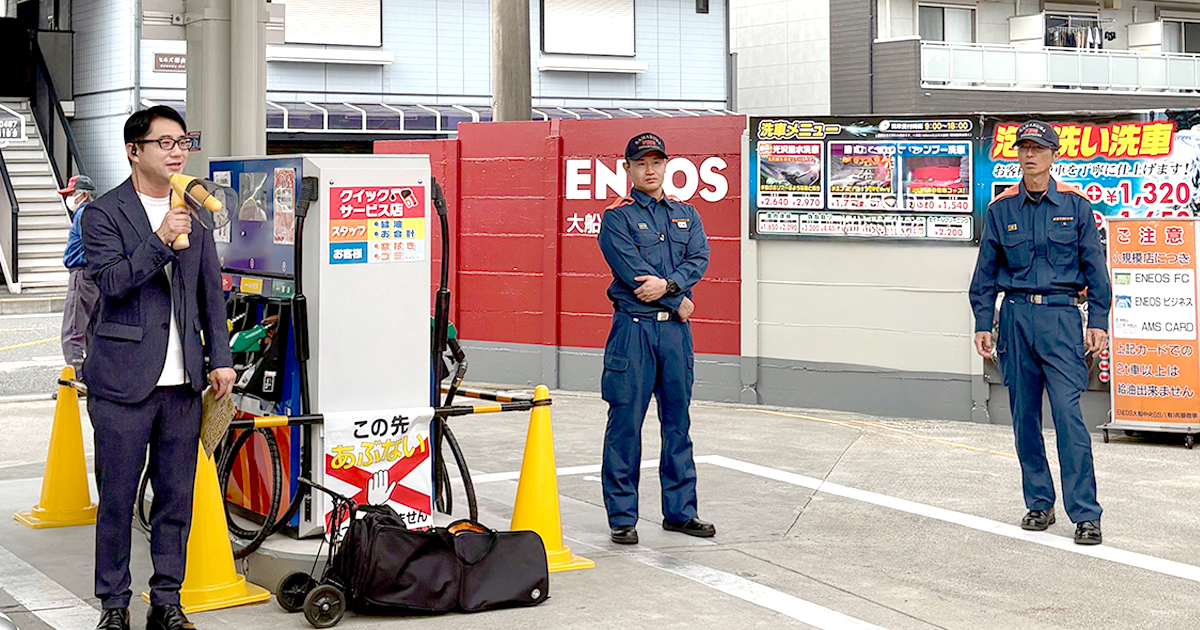 大船中央SS 兵藤社長、大船消防署長の挨拶から、もしかまスタートです!