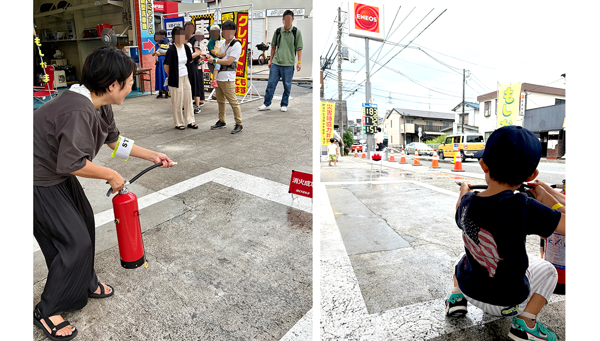 消火器体験では、消防士さんから消火器の使い方を説明してもらい、水を入れた消火器を使い、的を狙って噴射してみたよ。