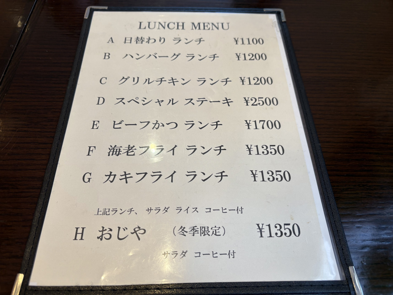 メニューは、ハンバーグ、グリルチキン、ステーキ、ビーフかつ、海老フライ、カキフライなど。