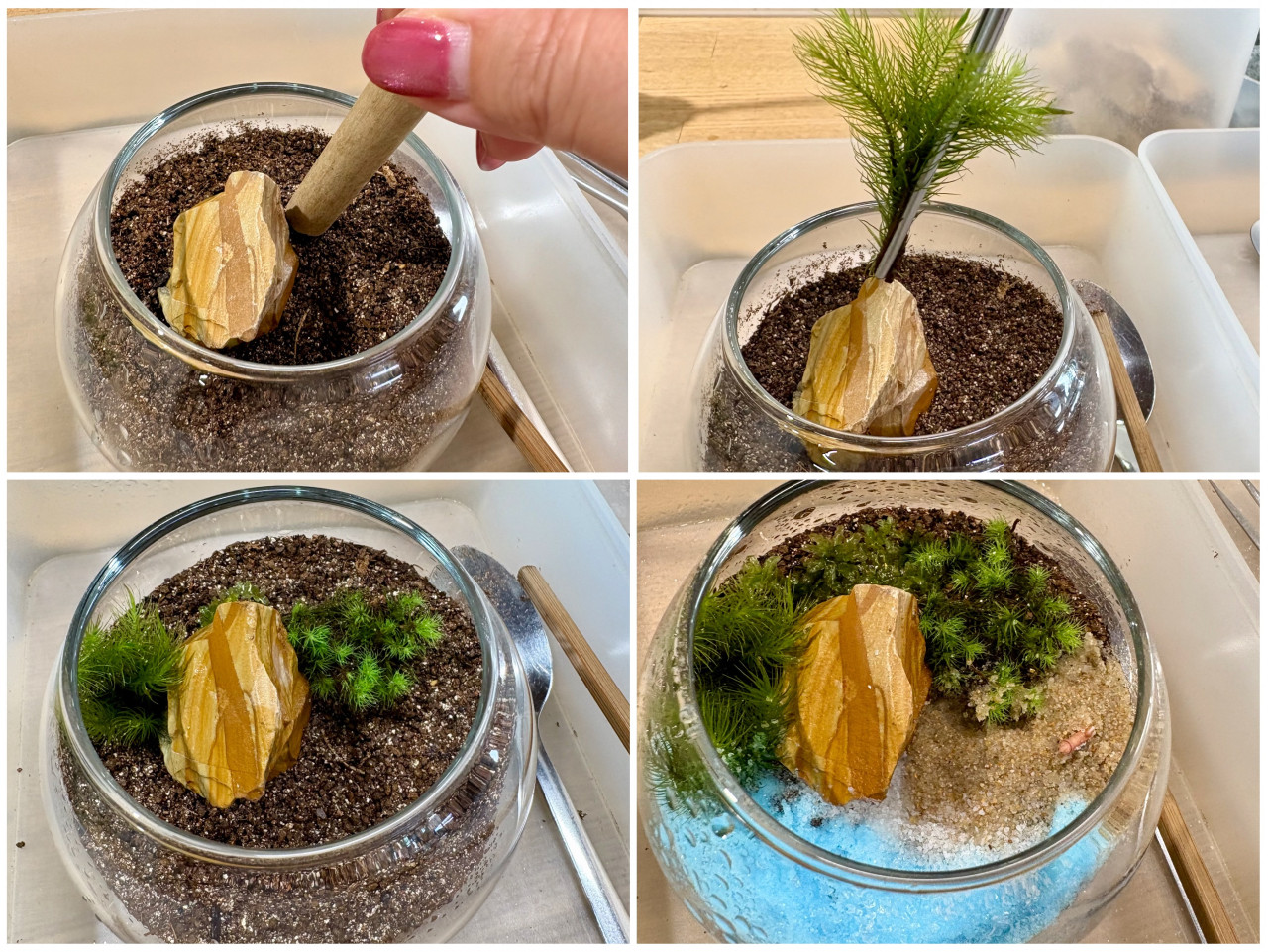 苔を植えたら、続いて、海をイメージした青い砂をさらさら~って流し込んでいきます。