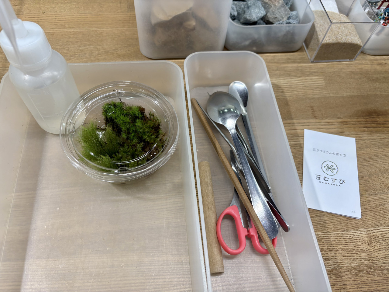 テーブルに1人ずつ苔テラリウムを作る素材・道具などがセットされています。