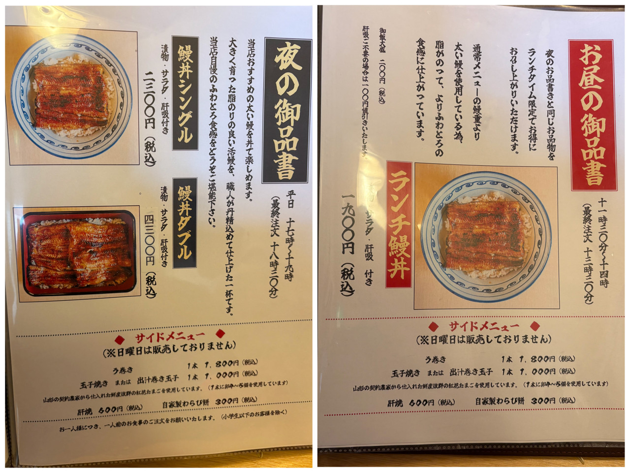 ランチタイムは、夜のお品書きと同じ鰻丼を、お得に食べられちゃうんです( *´艸`)