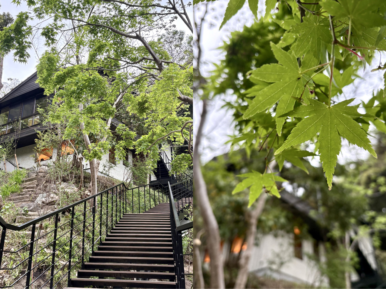 お店の前に到着すると、まずこの緑に囲まれた階段を登ります。