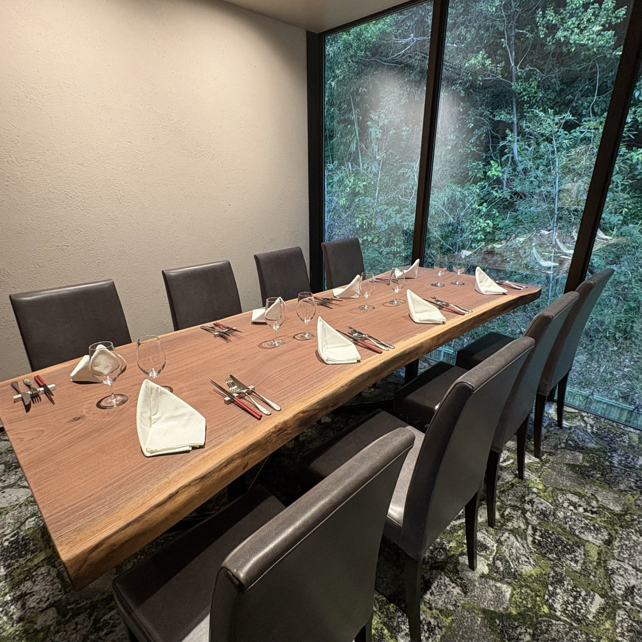 明るい時間は新緑に、夜は薪窯の火に癒される空間とは、なんとも贅沢。
