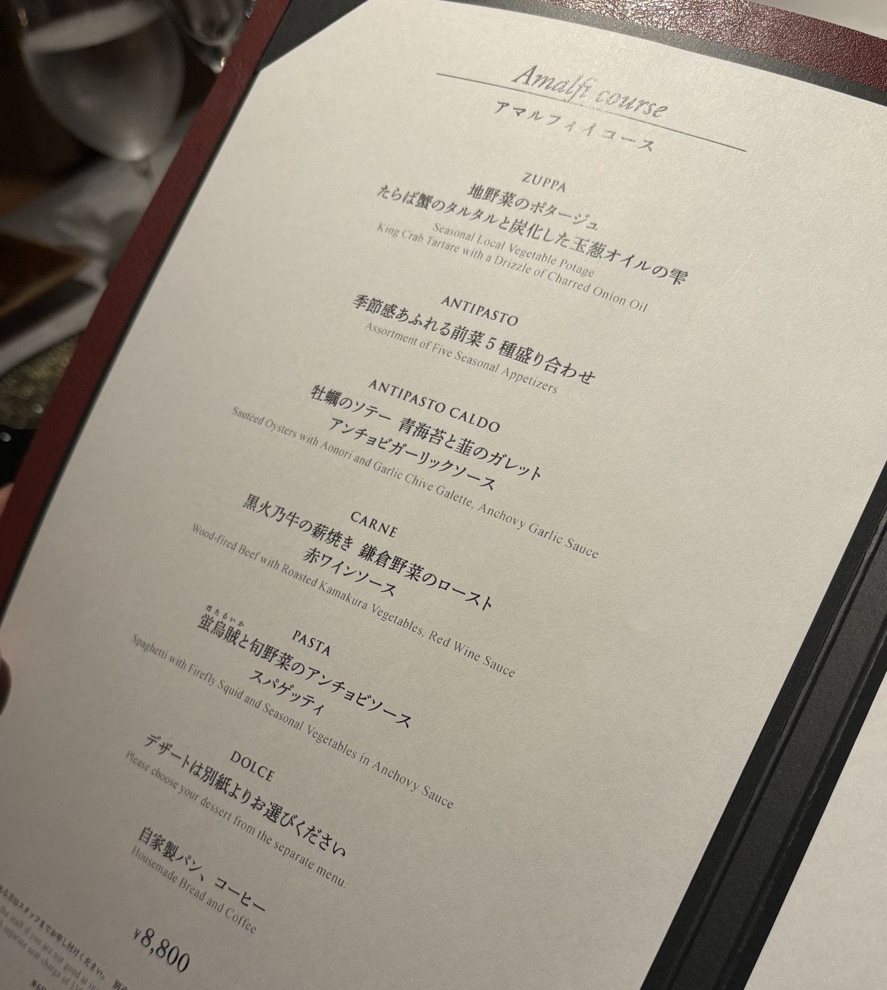 お食事はアマルフィイコース 8,800円。