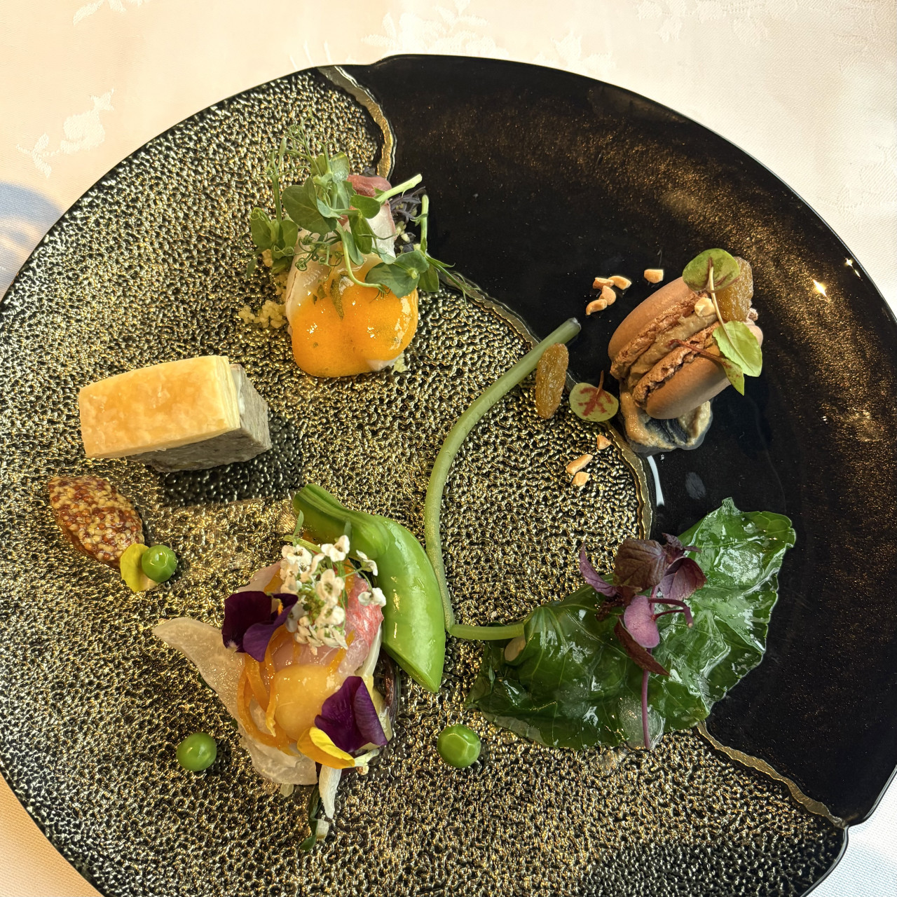鶏レバームースのマカロン、葉山葵と赤海老、金目鯛のカルパッチョ、豚のテリーヌ、水だこ